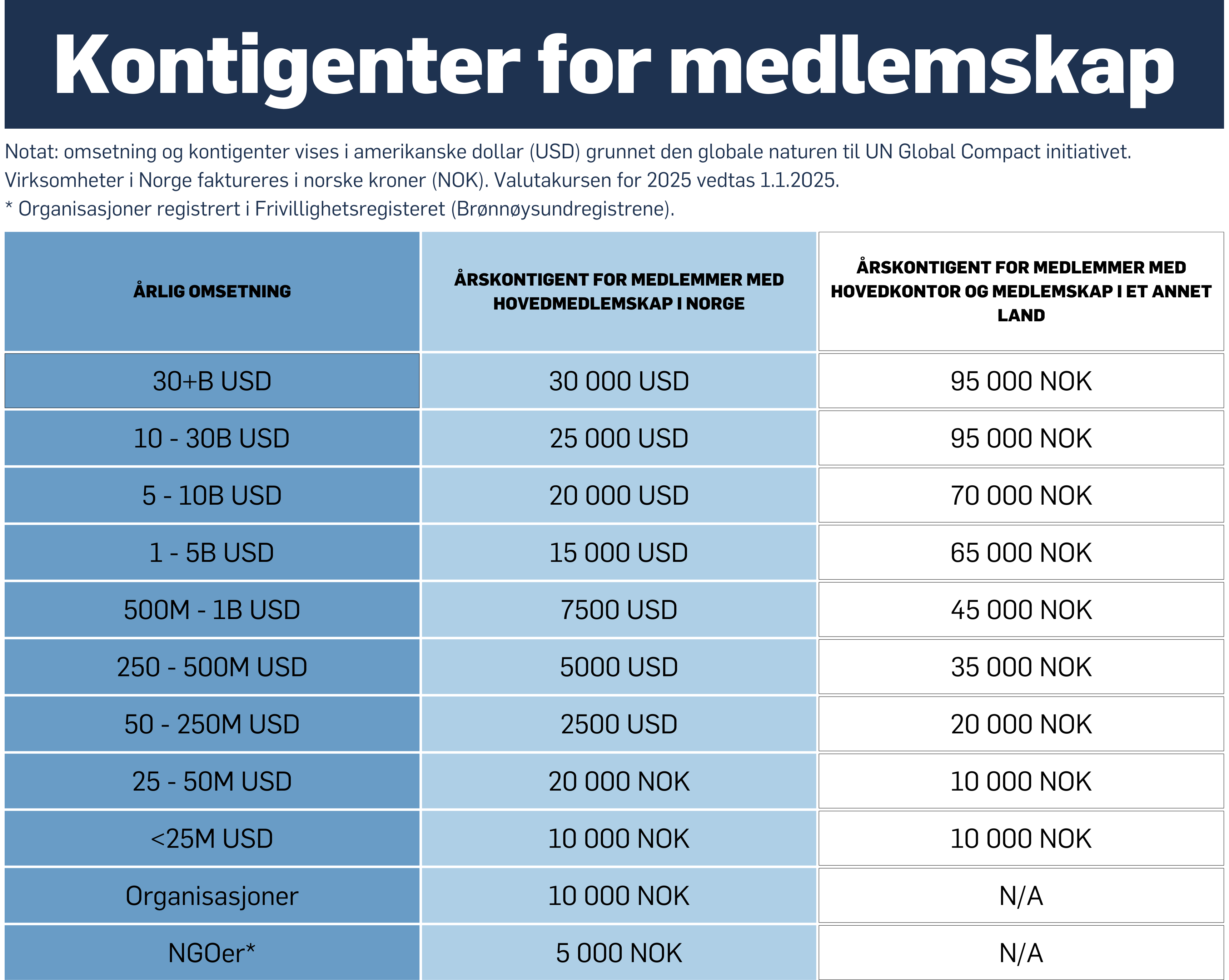 Notat: omsetning og kontingenter vises i amerikanske dollar (USD) grunnet den globale naturen til UN Global Compact initiativet. Virksomheter i Norge faktureres i norske kroner (NOK).