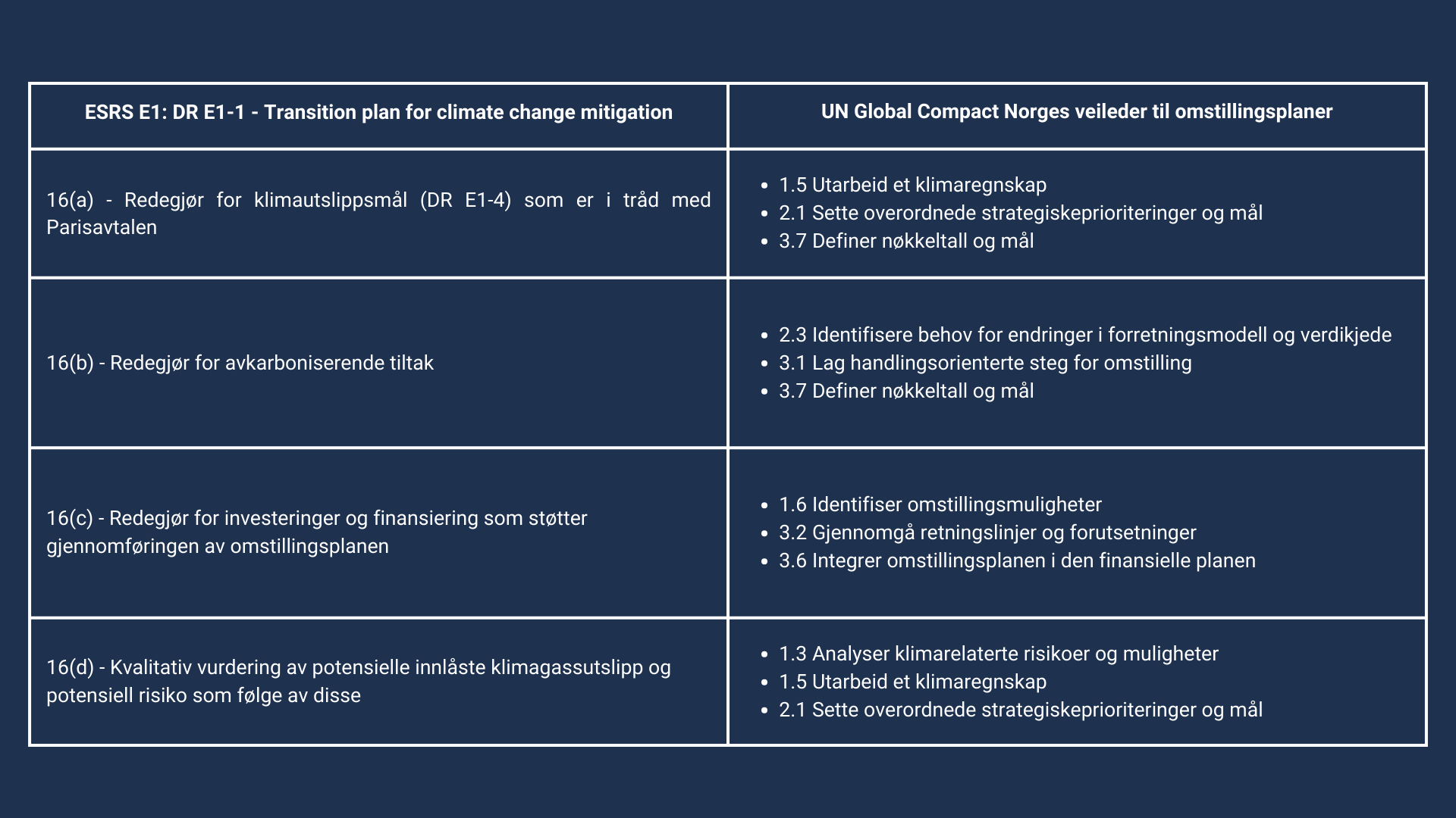 ESRS E1 (climate change) inneholder et opplysningskrav for omstillingsplaner (Disclosure requirenment (DR) E1-1. Oversikten under viser hvilke steg i veilederen som overlapper med opplysningskravene i DR E1-1.
