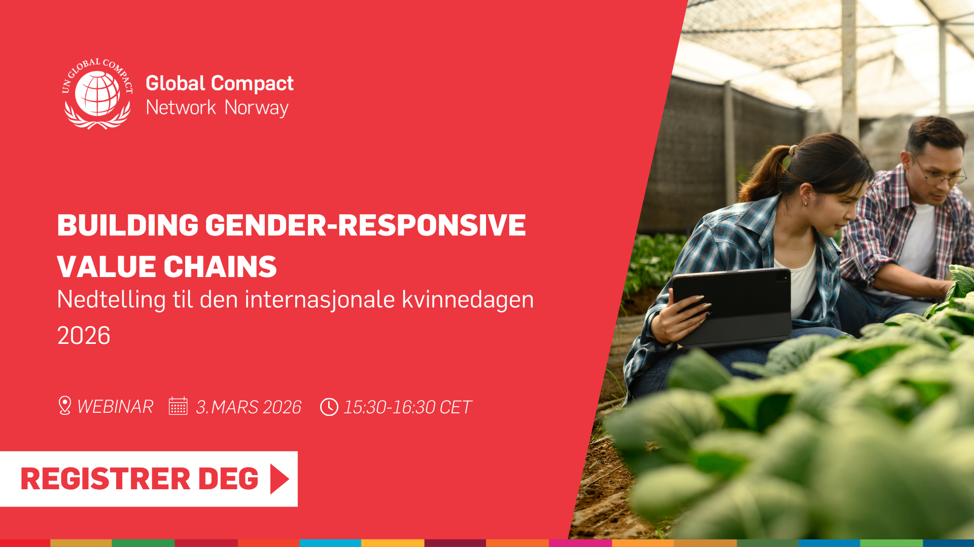 UN Global Compact inviterer til Countdown to International Women’s Day 2026, en interaktiv læringsreise som hjelper bedrifter å gå fra ambisjon til målbar handling. Fra 24. februar får du tilgang til fire live-sesjoner, praktiske verktøy og ressurser.