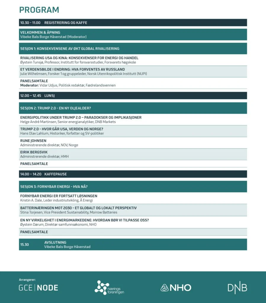 Årets konferanse skal løfte de store temaene og utfordringene som ligger foran oss med global rivalisering. Hva betyr det for oss som det strammes til mellom USA, Kina og Russland? Hvilken påvirkning vil dette ha for markedsutsiktene på kort og lang sikt, markeder og energiforbruk? Hvordan navigerer selskaper i en geopolitisk ustabil verden? Dette er noen av temaene vi skal belyse.