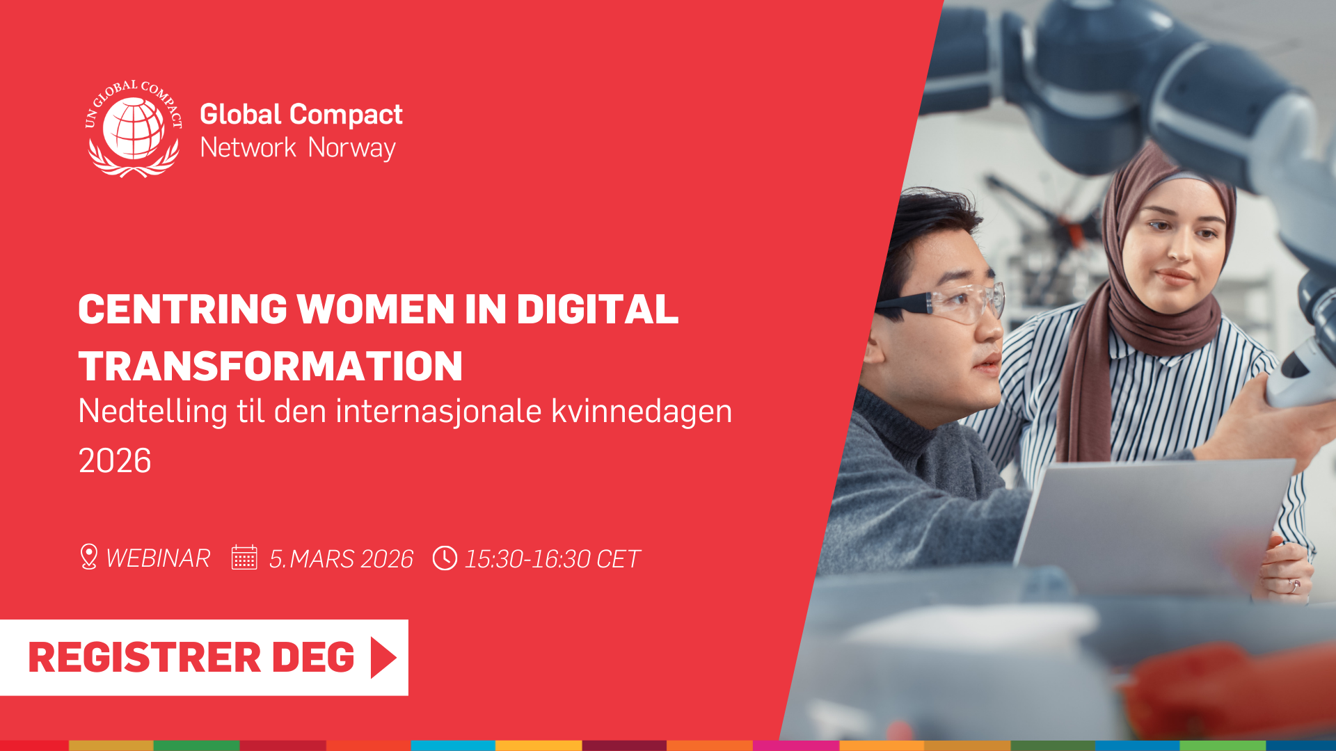 For å støtte dette arbeidet, inviterer vi deg til den siste direktesendte sesjonen i Nedtellingen til den Internasjonale kvinnedagen, Rewriting the Code: Collective Action to Center Women in the Digital Workplace Transformation.