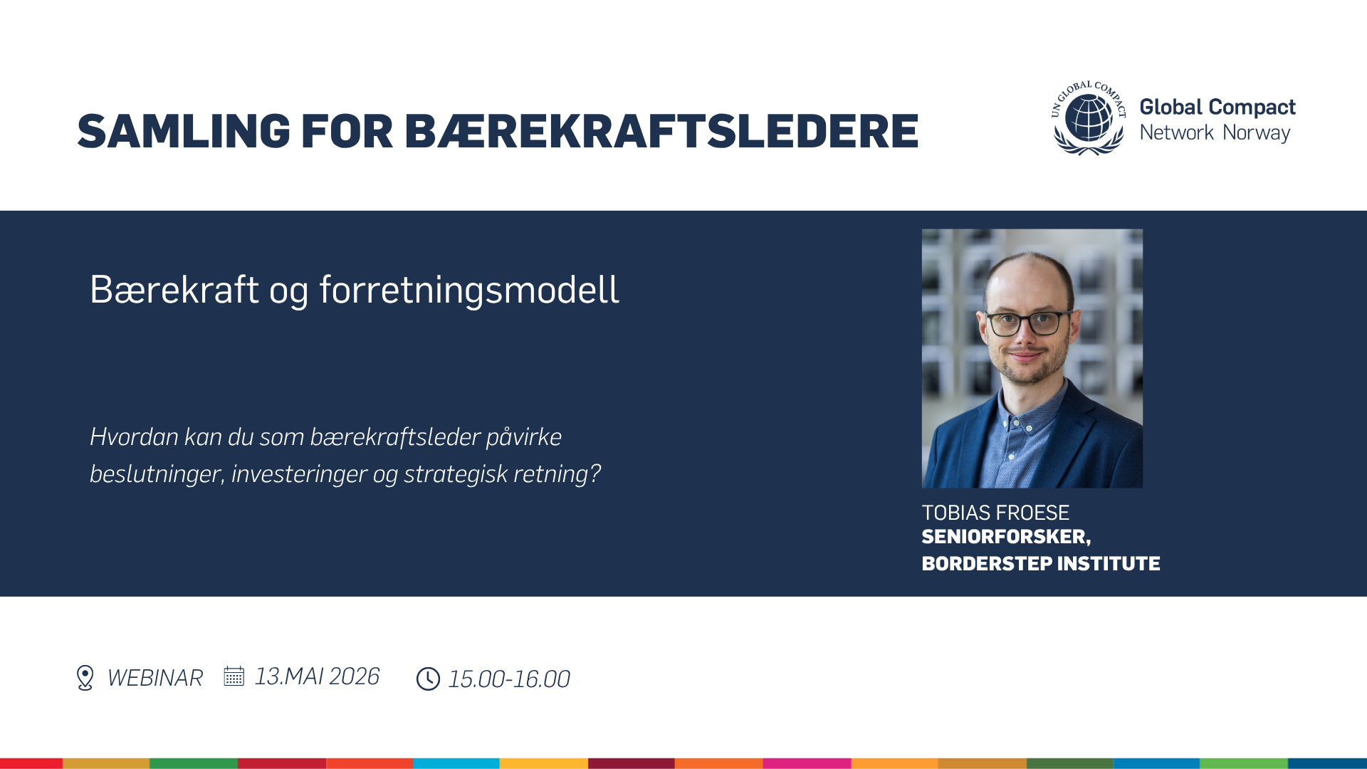Tobias Froese, seniorforsker ved Borderstep Institute med ekspertise innen bærekraftige forretningsmodeller og energiinnovasjon, med erfaring fra store selskaper som Beiersdorf, Philips og Humana, vil dele innsikt i hva som kjennetegner bærekraftige forretningsmodeller og hvor bærekraftsledere har størst påvirkningskraft. Videre jobber deltakerne i mindre grupper med egne problemstillinger, før vi samler trådene i plenum og løfter frem konkrete grep for økt gjennomslag i egen virksomhet.