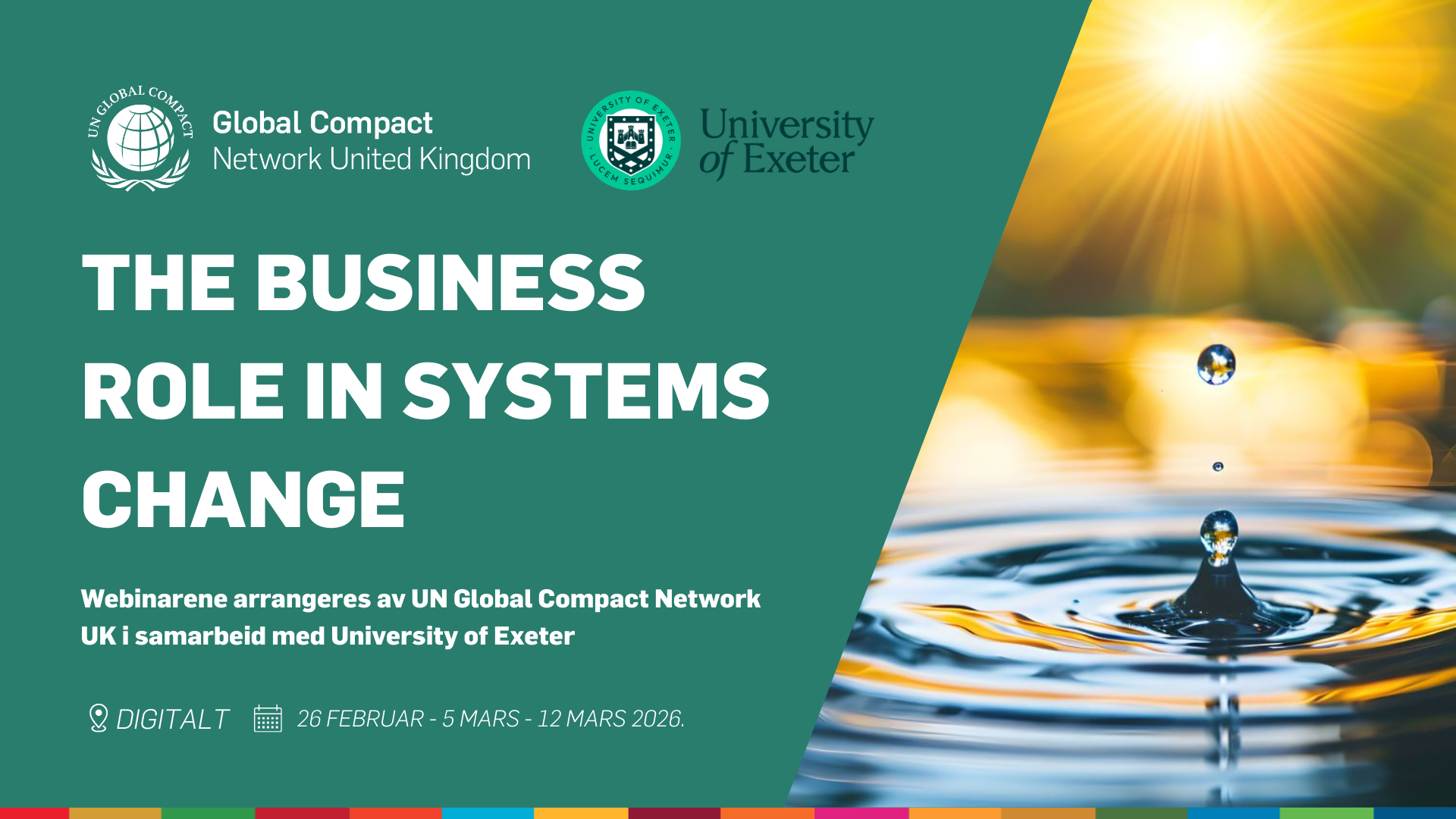 UN Global Compact Network UK, i samarbeid med University of Exeter, arrangerer en åpen webinarserie i tre deler om bedrifters rolle i systemendringer. Dette er åpne webinarer, og alle er derfor velkomne til å delta.