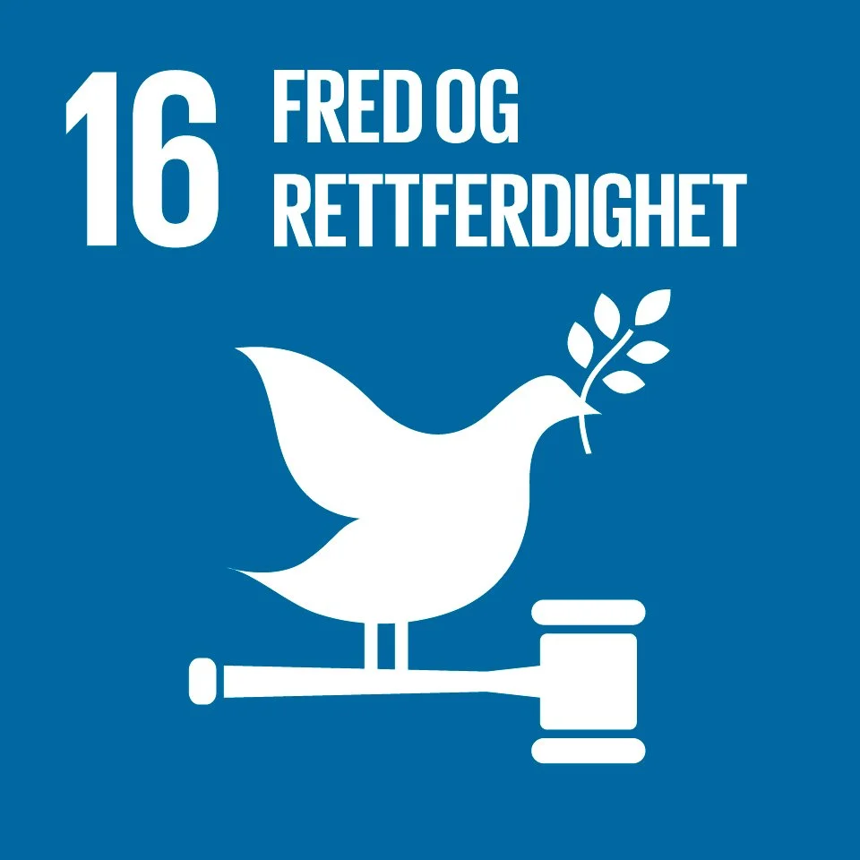 Fremme fredelige og inkluderende samfunn for å sikre bærekraftig utvikling, sørge for tilgang til rettsvern for alle, og bygge velfungerende, ansvarlige og inkluderende institusjoner på alle nivåer